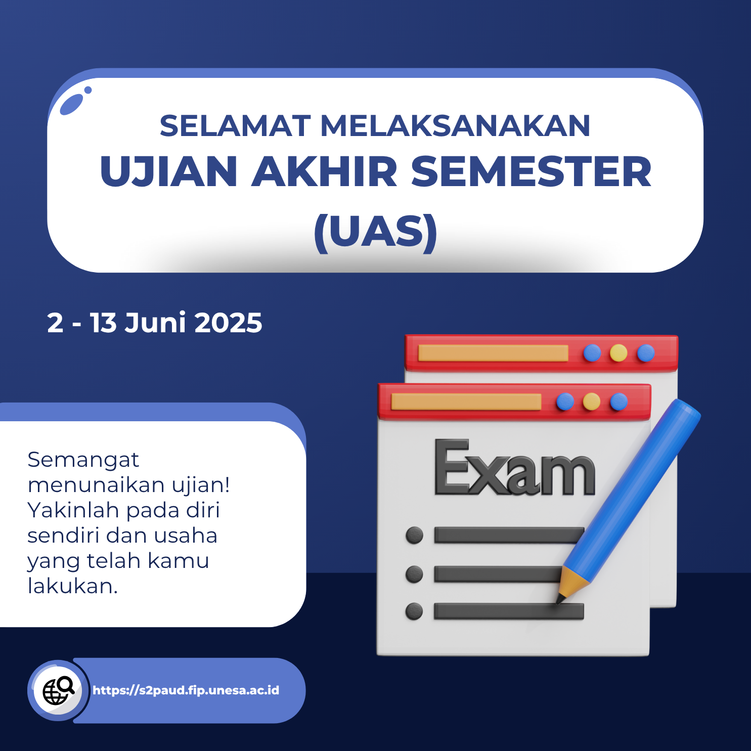 Program Studi S2 PAUD, Fakultas Ilmu Pendidikan, Universitas Negeri Surabaya secara resmi telah memasuki minggu Ujian Akhir Semester (UAS) Genap Tahun Akademik 2024/2025. Pelaksanaan UAS berlangsung